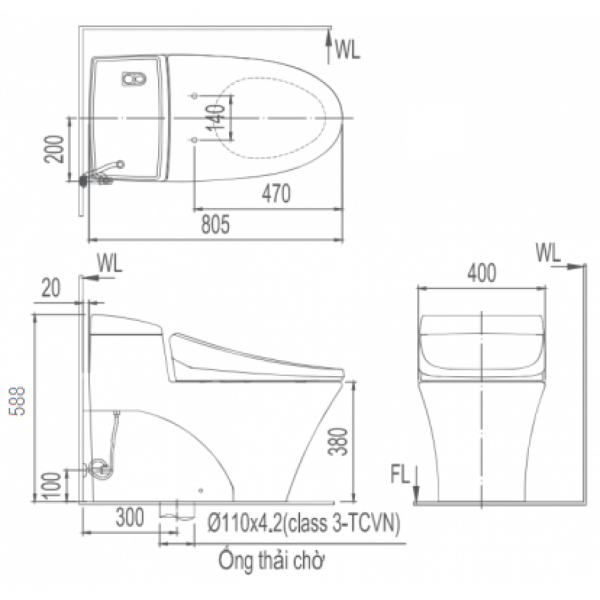 - Kiểu xả thẳng hút mạnh mẽ, rửa trôi mọi vết bẩn, tạo cho lòng bàn cầu luôn sạch sẽ