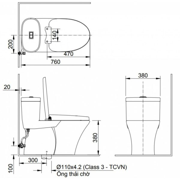 • Kích thước bồn cầu : 760 x 380 x 639mm