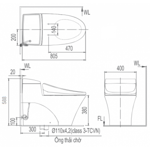 - Kích thước bồn cầu: 805x400x588 mm (DxRxC)