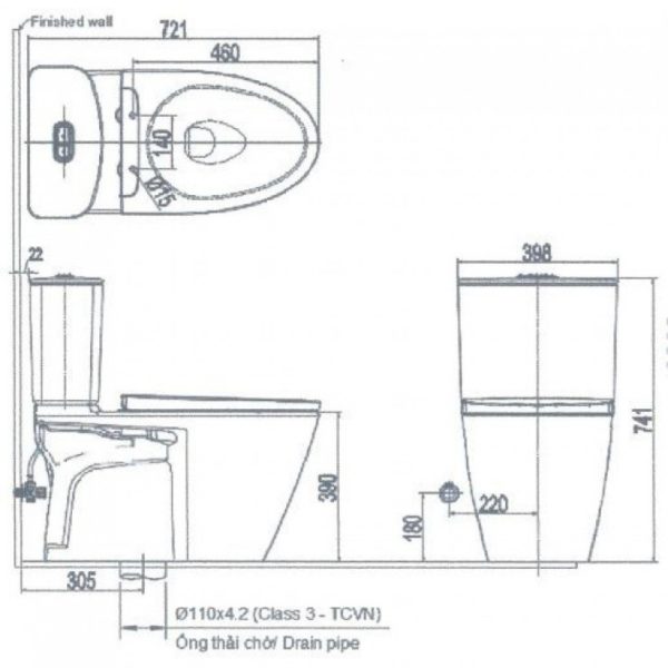 - Kích thước bồn cầu: 720 x 372 x 740 mm (DxRxC)