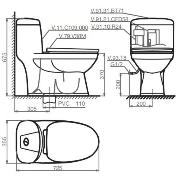 Bản vẽ bệ xí bệt C109 Viglacera 1 khối