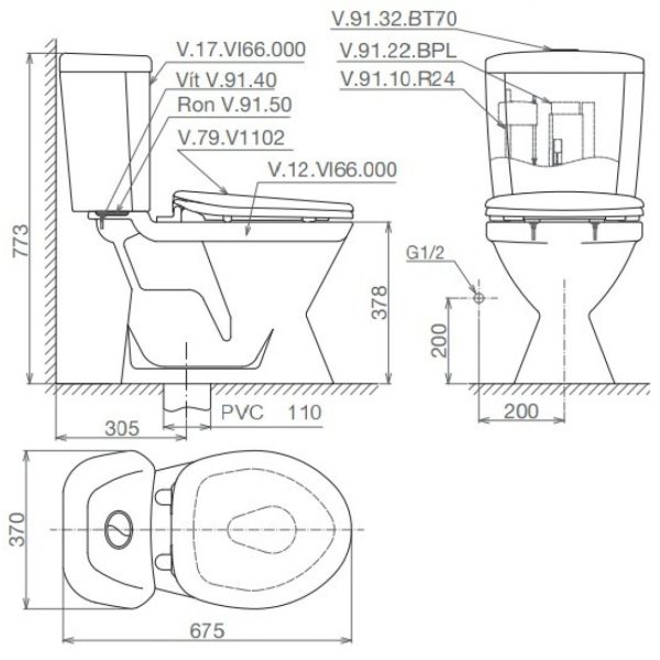 Bản vẽ bệ xí bệt Vl66 Viglacera 2 khối