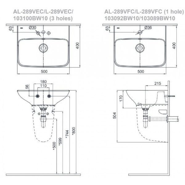 Bản vẽ chậu lavabo Inax AL-289VEC & AL-289VFC