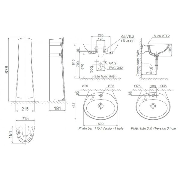 Bản vẽ lavabo Viglacera VTL2/VI1T chân dài