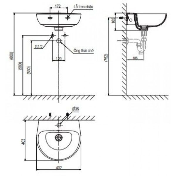 - Kích thước lavabo: 432 x 403 x 165 mm