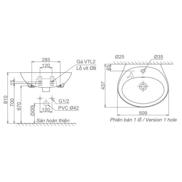 Bản vẽ kích thước lavabo VTL2 Viglacera