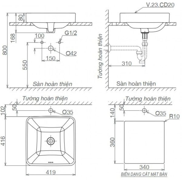 Bản vẽ kỹ thuật chậu rửa mặt CD20 Viglacera