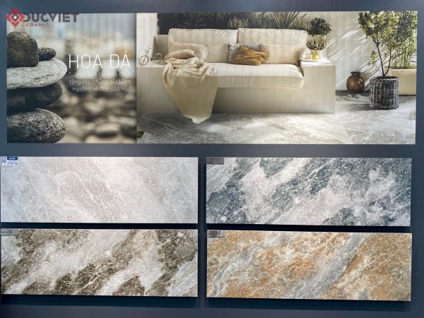 Hoa Đá – Nguồn cảm hứng từ dòng dung nham nóng chảy Khi ngọn núi lửa nổi giận, phun ra thứ nham thạch cuồn cuộn đỏ lửa gây nỗi sợ hãi kinh hoàng nhưng lạ thay nó lại có vẻ đẹp kỳ diệu của sức mạnh và sự quyết liệt. Dòng dung nham tuôn trào trông giống như những bông hoa ngày khai nở, rực rỡ và vô cùng mạnh mẽ. Hình ảnh đó đã được thể hiện bằng những đường vân táo bạo trên BST gạch men cao cấp Hoa Đá, dòng sản phẩm giúp người dùng được thưởng thức trọn vẹn vẻ đẹp đầy sống động mà thiên nhiên ban tặng. Nếu như An Cư, An Niên hay Mộc Lan mang đến những cảm giác trong trẻo, nhẹ nhàng thư giãn thì BST Hoa Đá lại thể hiện cho nét đẹp cá tính với những đường vân tự nhiên, phóng khoáng và mãnh liệt. Hoa Đá không chỉ kích thích ánh nhìn mà bề mặt Sugar với lớp hạt sần mang đến thứ cảm xúc thô ráp, mộc mạc của đá. Điều này phù hợp cho những tâm hồn yêu vẻ đẹp phá cách, thích chinh phục và tận hưởng những điều mới mẻ, độc đáo.