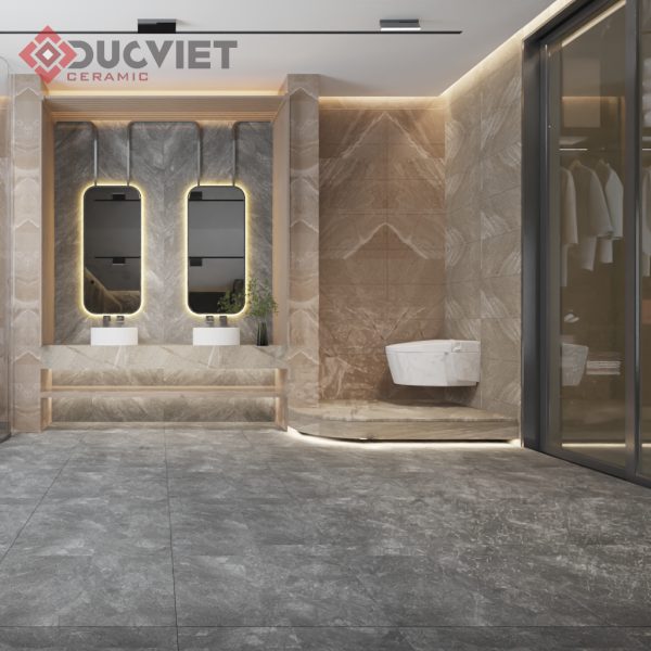 Sản phẩm có màu ghi đậm được in các họa tiết vân cát sắc nét trên bề, họa tiết đó giúp gạch phù hợp cho nhiều phong cách thiết kế từ sang trọng, cổ điển cho đến đơn giản và hiện đại.