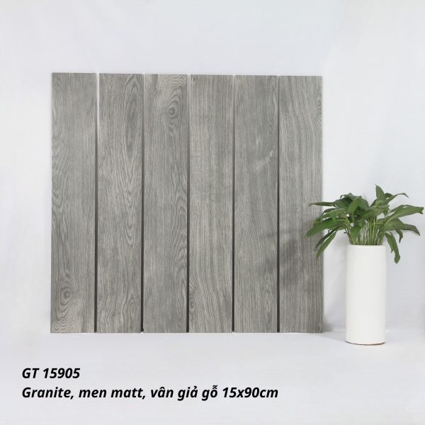 Gạch ốp lát GT15905 thuộc dòng Granite (Porcelain) của Viglacera. Gạch có hiệu ứng gỗ được in bằng công nghệ kỹ thuật số trên gam màu xám trung tính làm chủ đạo, vân gỗ nhẹ nhàng được còn được in nổi trên thân gạch cũng như các kỹ thuật tạo đường xẻ và vết xước chuyên dụng mô phỏng chân thật nhất của tự nhiên cả về hình dáng và cảm nhận.