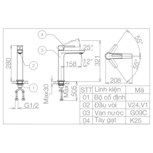Bản vẽ vòi lavabo Viglacera VG 125 cổ cao