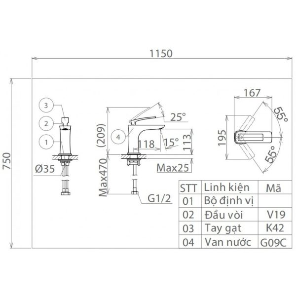 Bản vẽ kỹ thuật vòi Viglacera lavabo VG142