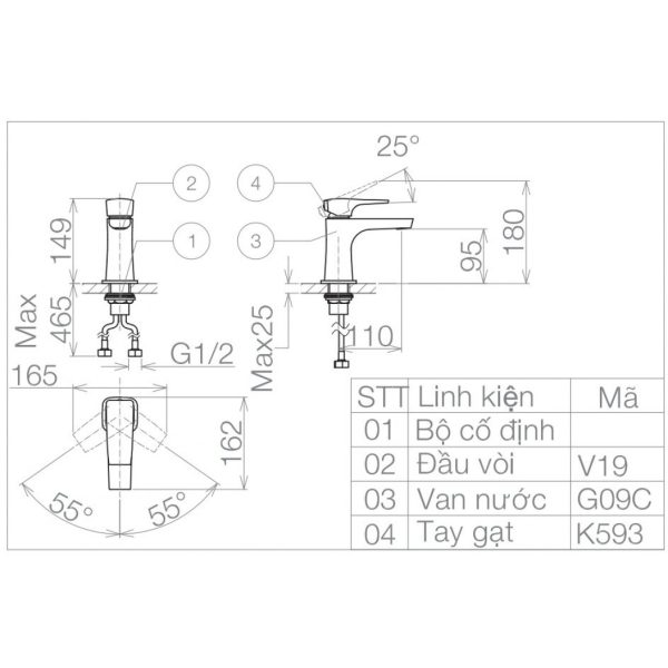 Bản vẽ kỹ thuật vòi Viglacera lavabo VG 143